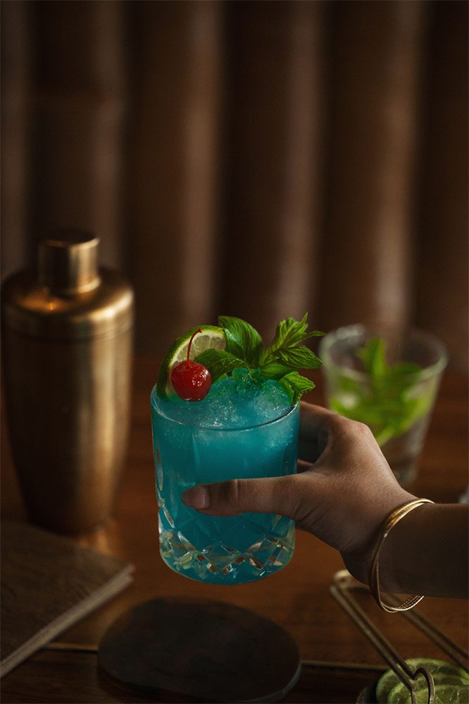 Malibu Coconut Rum, SKYY Vodka, Blue Curacao, pineapple, lime, falernum