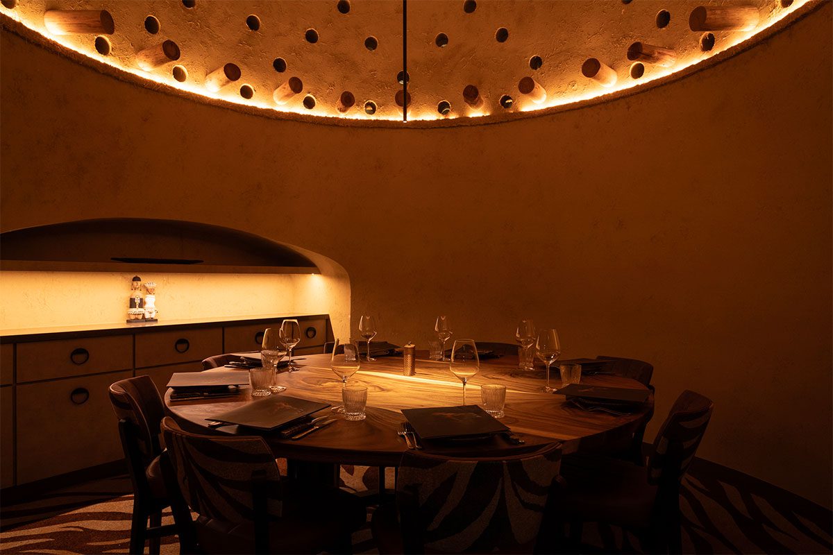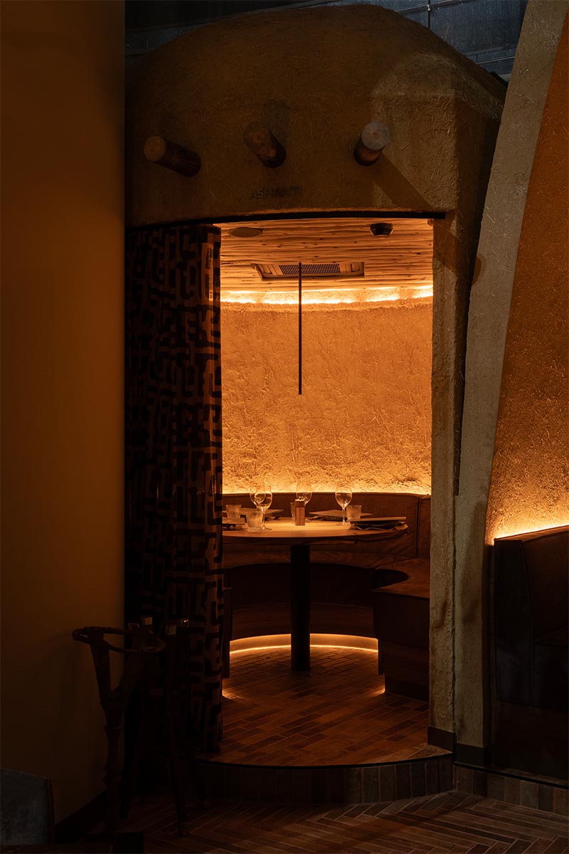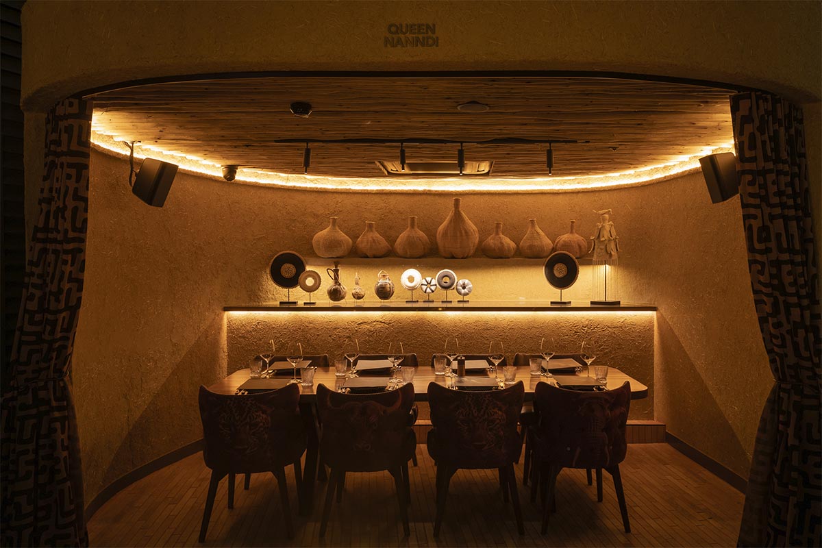 Ashanti is a semi-private dining room ideal for groups of 5. The space measures 4 square metres, offering a comfortable setting for private bookings. Table setup includes a round table. Speakers are built into the space, with adjustable volume. Air conditioning is provided with personal control.