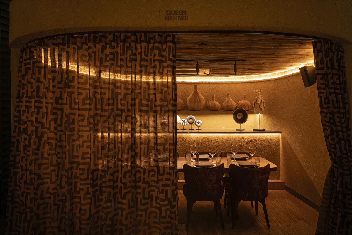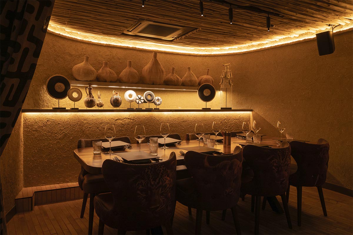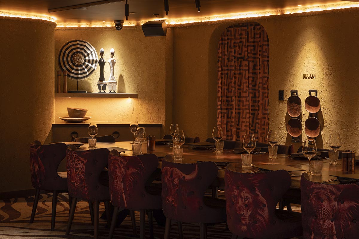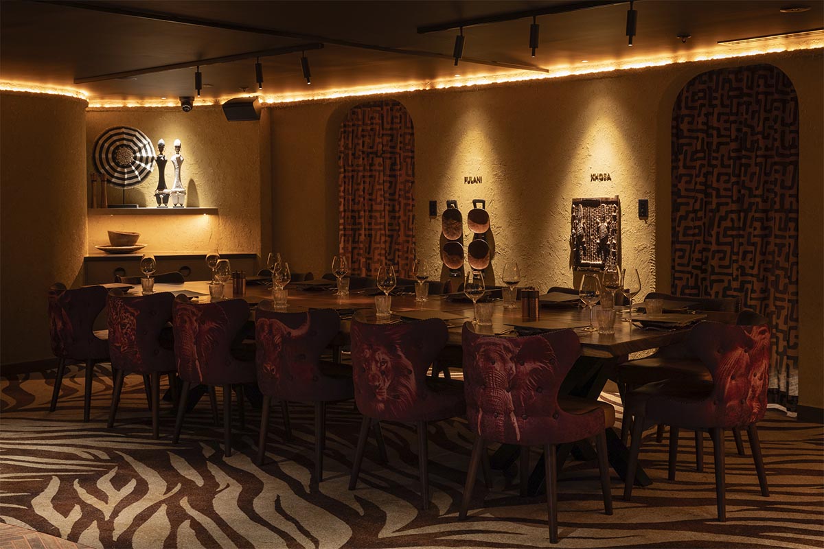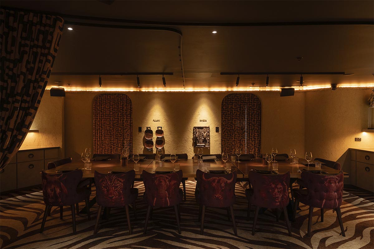 Fulani Xhosa is a semi-private dining room ideal for groups of 16-18. It seats 16 & the space measures 25 square metres, offering a comfortable setting for private bookings. Table setup includes a long table. It’s also suitable for presentations or speeches. A TV is available for media or visual needs. Speakers are built into the space, with adjustable volume. Air conditioning is provided with personal control.